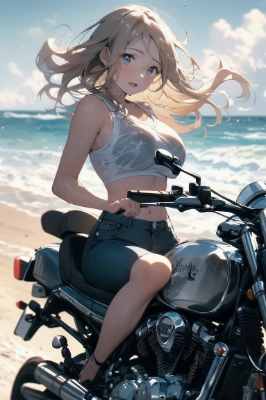 girl,RAW photo, best quality,realistic, photo-realistic, best quality ,masterpiece,an extremely delicate and beautiful, extremely detailed,2k wallpaper, Amazing, finely detail, 8k wallpaper,huge filesize , ultra-detailed, highres, extremely detailed,realistic, 8K, Ultra-High Definition, highest quality, ultra high resolution, (realistic:1.3), High quality texture, (2girls:1.2), rainbow Camisole, denim shorts, ocean, medium breast, blond hair, full body, underboob, pattern, (tan), wet hair, wet clothes, wet skin,(motorcycle:1.2), Riding on motorcycle
