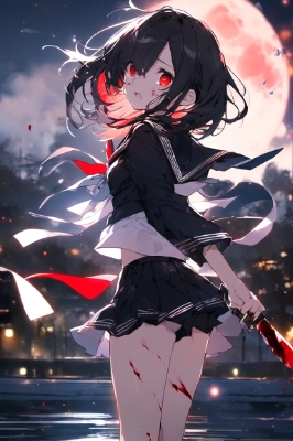 ((extraordinary, best beauty, new, best quality, high definition, detailed background, best quality, high definition)16 years old, female, yandere, medium hair, bangs that extend to one eye, black hair, black sailor suit, red eyes, ruthless Bloody hands and bloody clothes, (holding a bloody knife), (standing and pointing the knife at someone), (expression of despair), (red full moon), (midnight on the way to school).