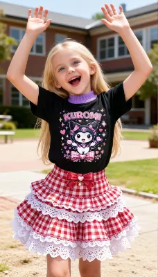 クロミTシャツとチェック柄ティアードスカートのコーデ (新モデル生成テスト)