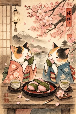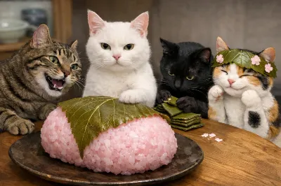 桜餅をたべるニャ!