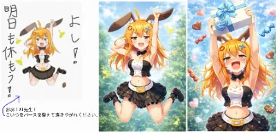 適当に描いた絵を見せてポーズ変えて生成させるのが自由度的に最強だと思います。