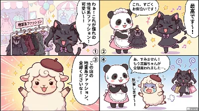 黒猫ちゃんが服屋さんで地雷系ファッションの服を買う四コマ漫画だわん!