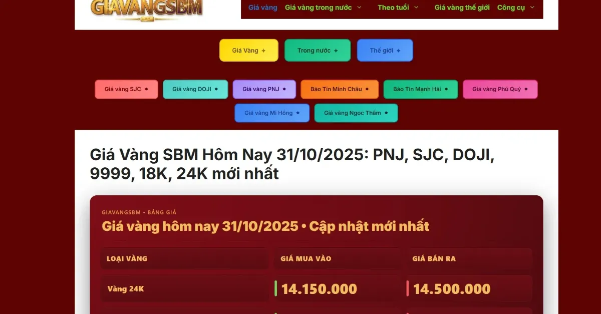 156604Giá Vàng SBM (GiaVangSBM) cung cấp bảng giá vàng trực tuyến đầy đủ, cập nhật liên tục từng phút, hiển thị biểu đồ biến động, phân tích xu hướng, dự báo giá và tin tức thị trường giúp người dùng theo dõi, đánh giá và đưa ra quyết định mua bán vàng chính xác. https://giavangsbm.co/